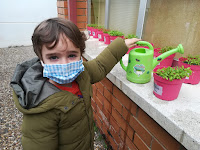 Los alumnos de Educación Infantil de 3 años B cuidan muy bien de sus macetas. Las ponen al sol y miran si les hace falta agua para regarlas. Cada uno es responsable de la suya y este es el magnífico resultado.